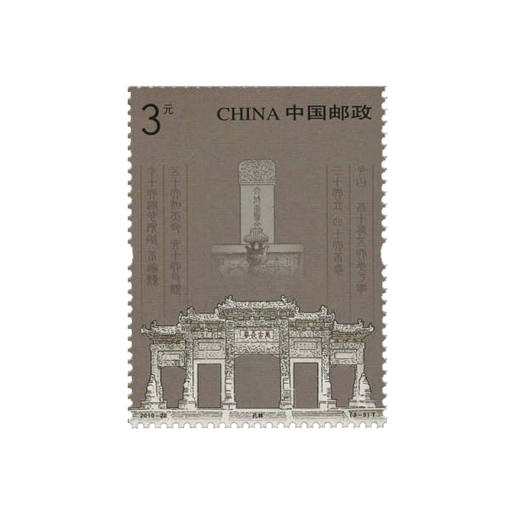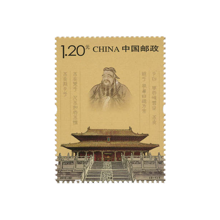 2010年9月28日是孔子诞辰2560周年,中国邮政于当日发行2010-22《孔庙、孔府、孔林》特种邮票一套三枚,面值依次为1.20元、1.20元和3元,同时还发行小全张一枚,售价为8.10元。这套邮票由著名邮票设计家郝旭东、陈景异联合设计,分别以孔庙大成殿、孔府重光门和孔林万古长春坊为主图,以孔子行教像、《论语》古籍和孔子墓前石碑为背景,并有论语中的精典语句隐印其中。