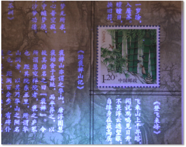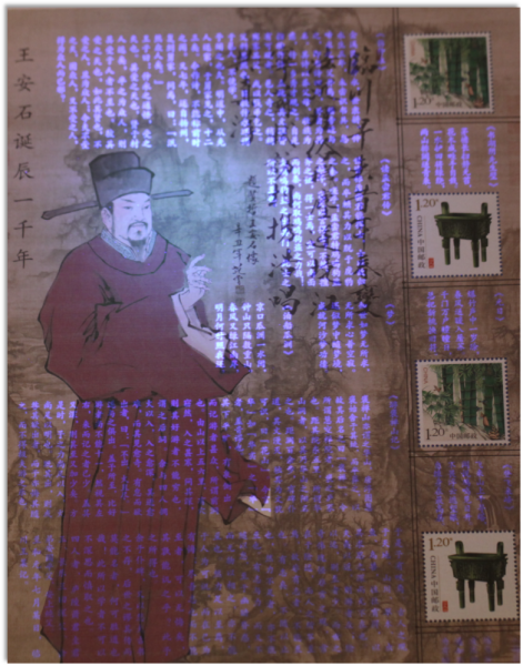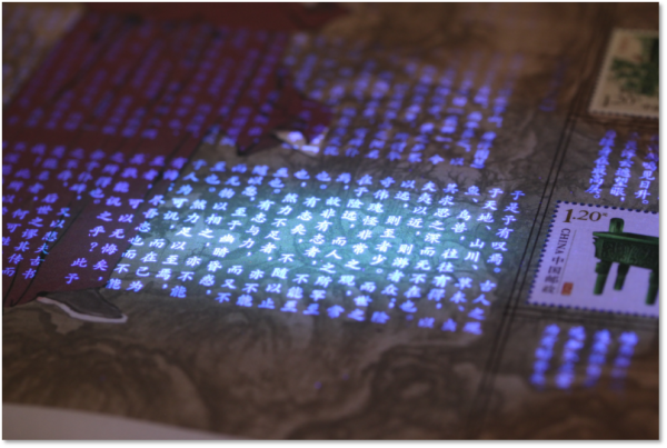 邮票附图在紫光灯下呈现王安石代表作品,高亮白荧光效果。