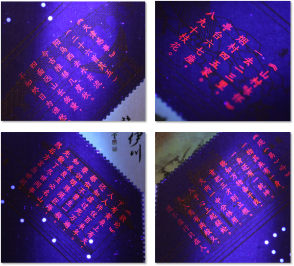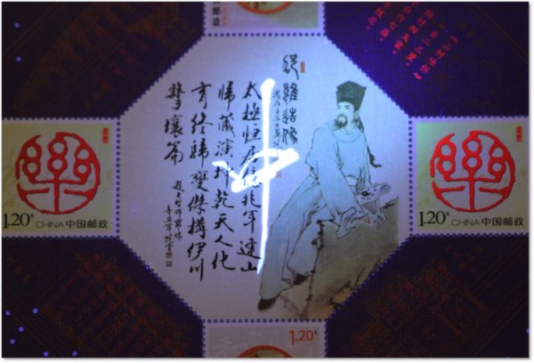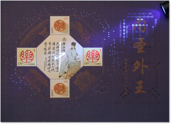 邮票边饰四处地点体现邵雍人生轨迹,紫光灯下呈现与其人生阶段对应的邵雍诗作,高亮红荧光效果。