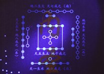 图中白圈代表天,属阳,黑点代表地,属阴。按照方位,以奇数和偶数分别组合。