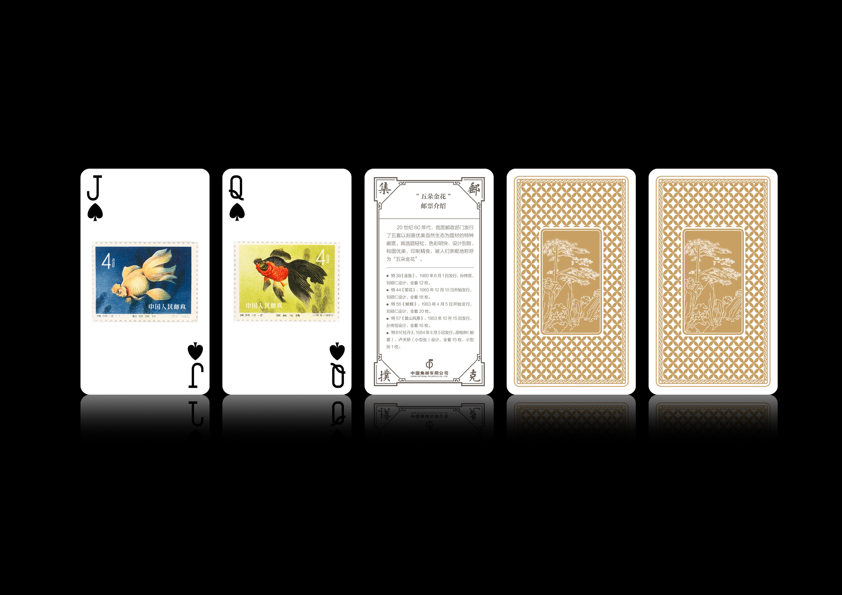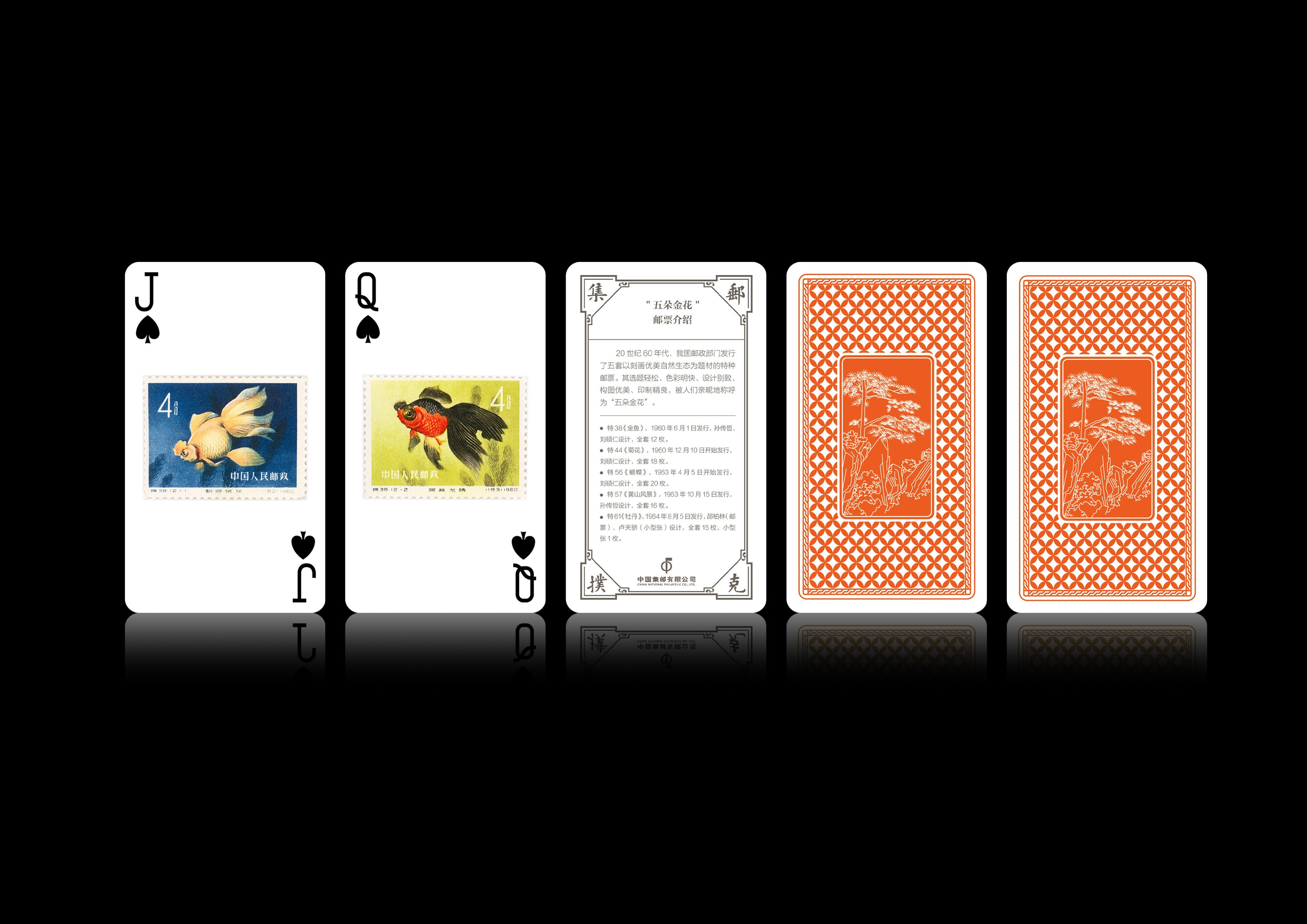 20世纪60年代,我国邮政部门发行了《金鱼》《菊花》《蝴蝶》《黄山风景》《牡丹》等五套以刻画优美自然生态为题材的特种邮票,其选题轻松、色彩明快、设计别致、构图优美、印制精良,被人们亲昵地称呼为“五朵金花”。本次制作特选取《金鱼》邮票图案,仿印在扑克牌四种花色的J、Q、K牌上。