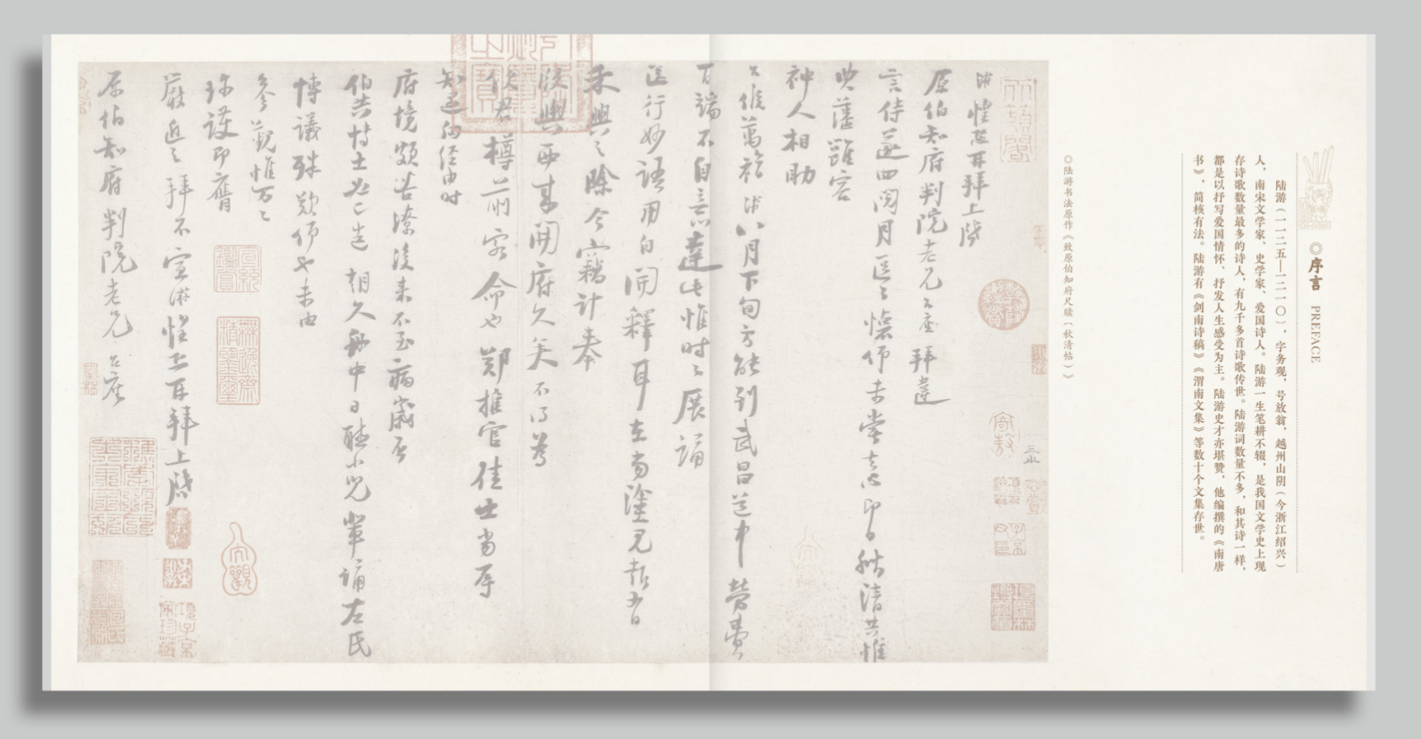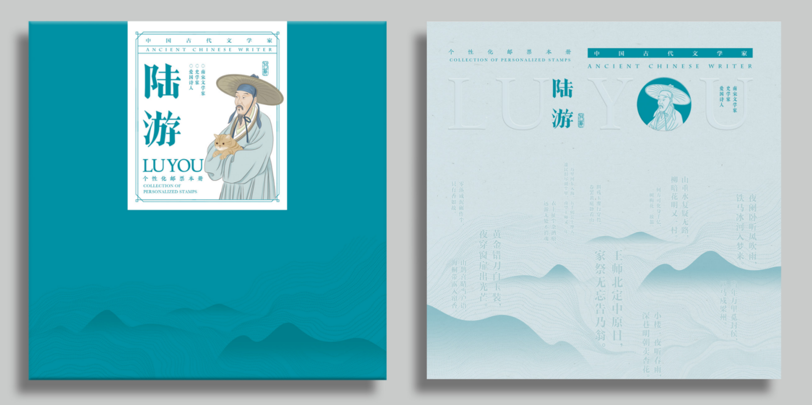 《中国古代文学家——陆游》个性化邮票本册设计力求简约文雅,体现陆游的诗词文化意境。人物形象选用目前最具代表性的陆游像进行再创作。陆游抱猫,是陆游的个人爱好,也是田园生活、国家命运的寄托。