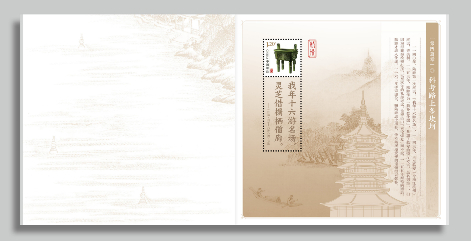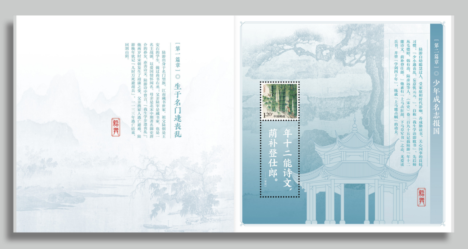 含六枚个性化邮票页,分别为《竹》、《诚信》主图,附图为陆游的词作或游历所到之处的著名建筑。