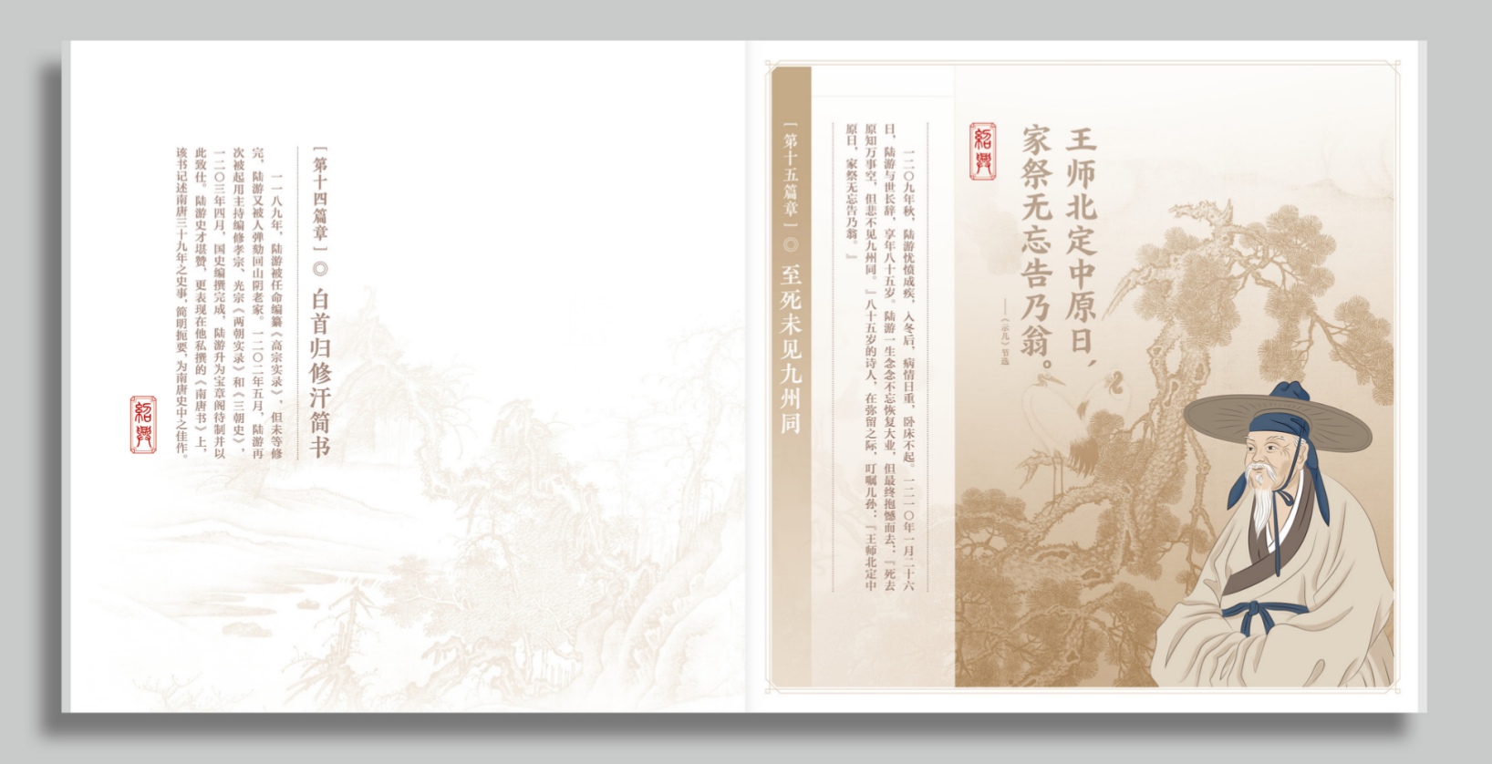 封面和插套体现“山河”的理念,从大的角度来看,他一辈子追求祖国山河统一完整,爱国爱家,“王师北定中原日,家祭无忘告乃翁”,从小的概念讲,他热爱大好山河,“山重水复疑无路,柳暗花明又一村”。