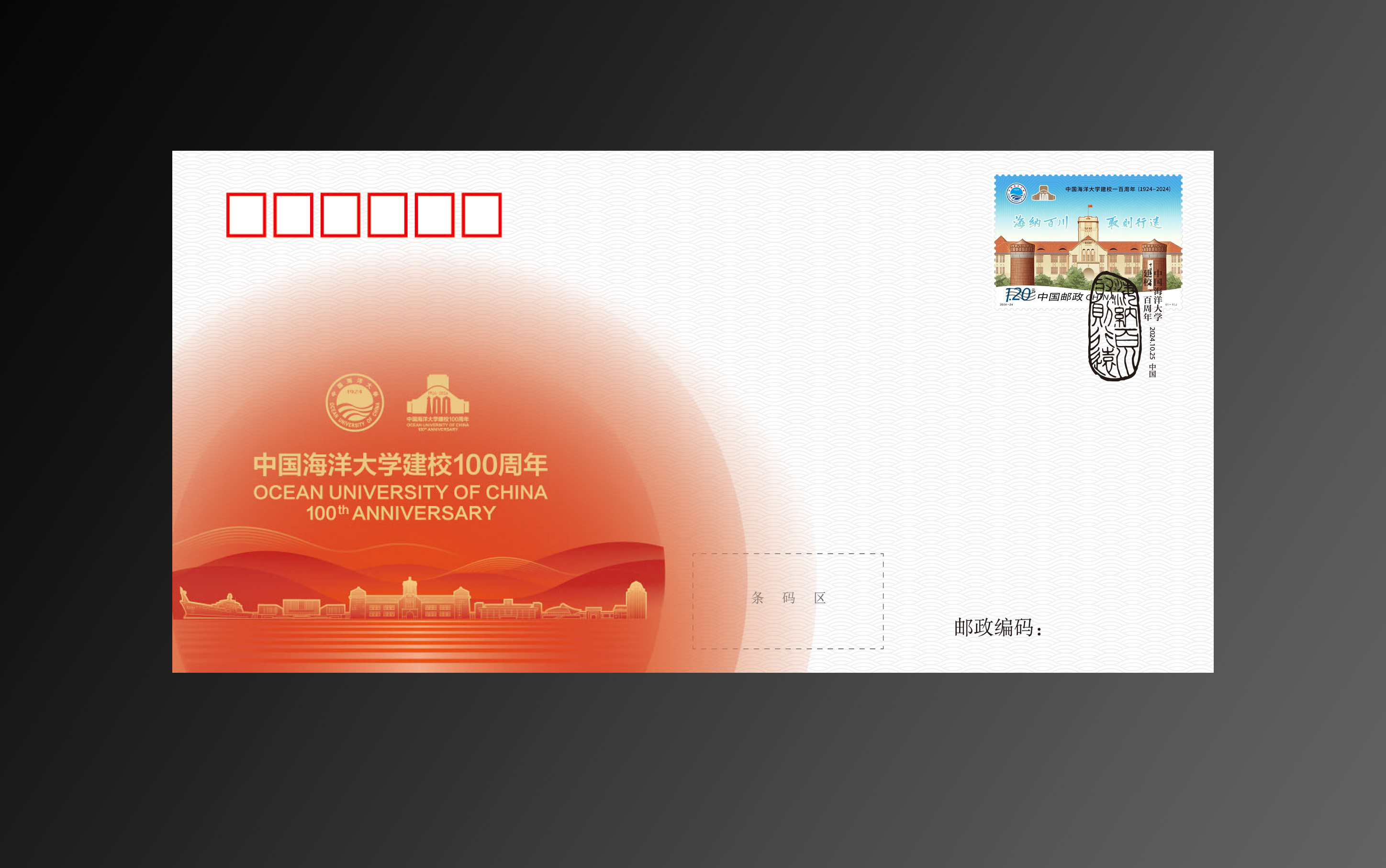 中国集邮有限公司于2024年10月25日发行《中国海洋大学建校一百周年》首日封一套一枚,盖销首日戳。