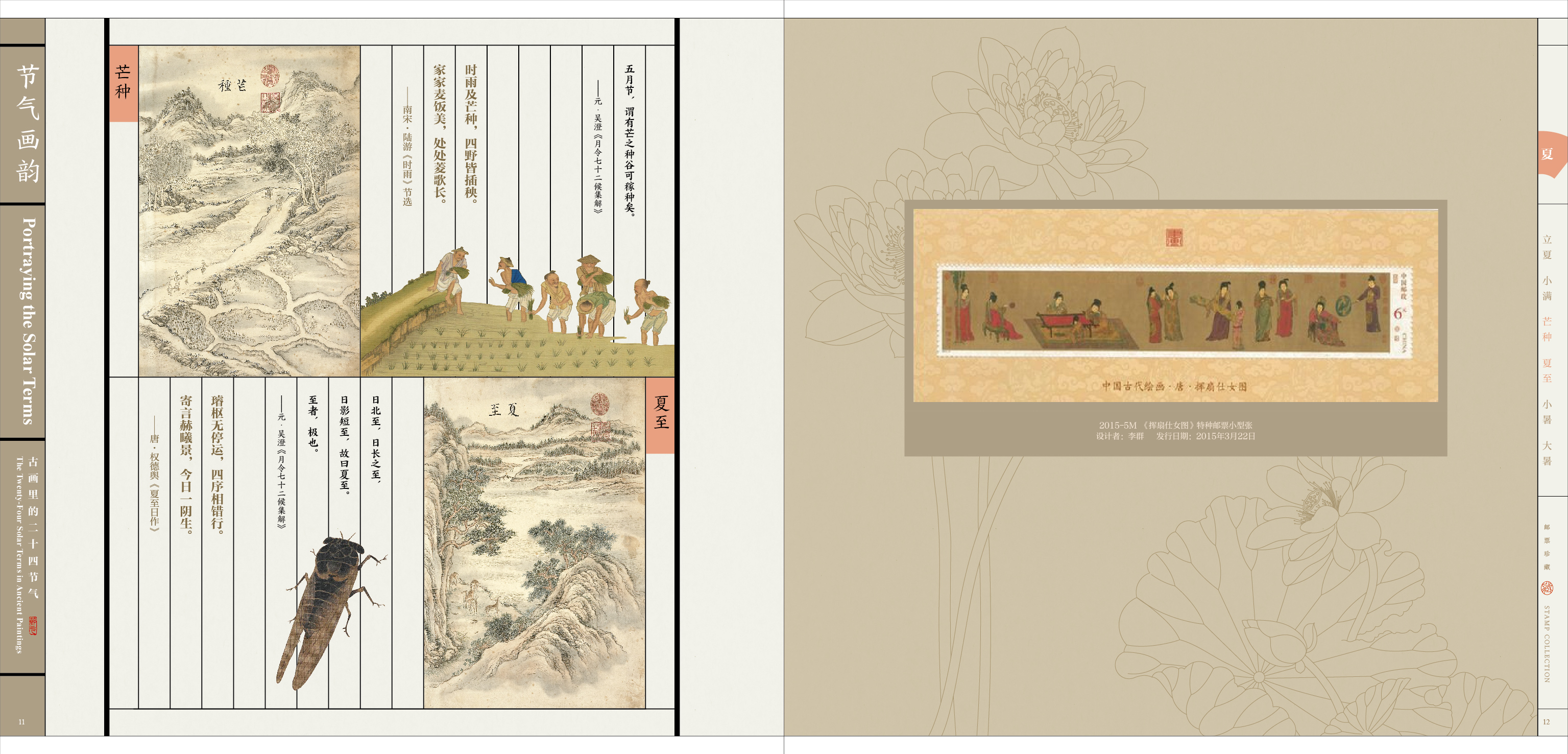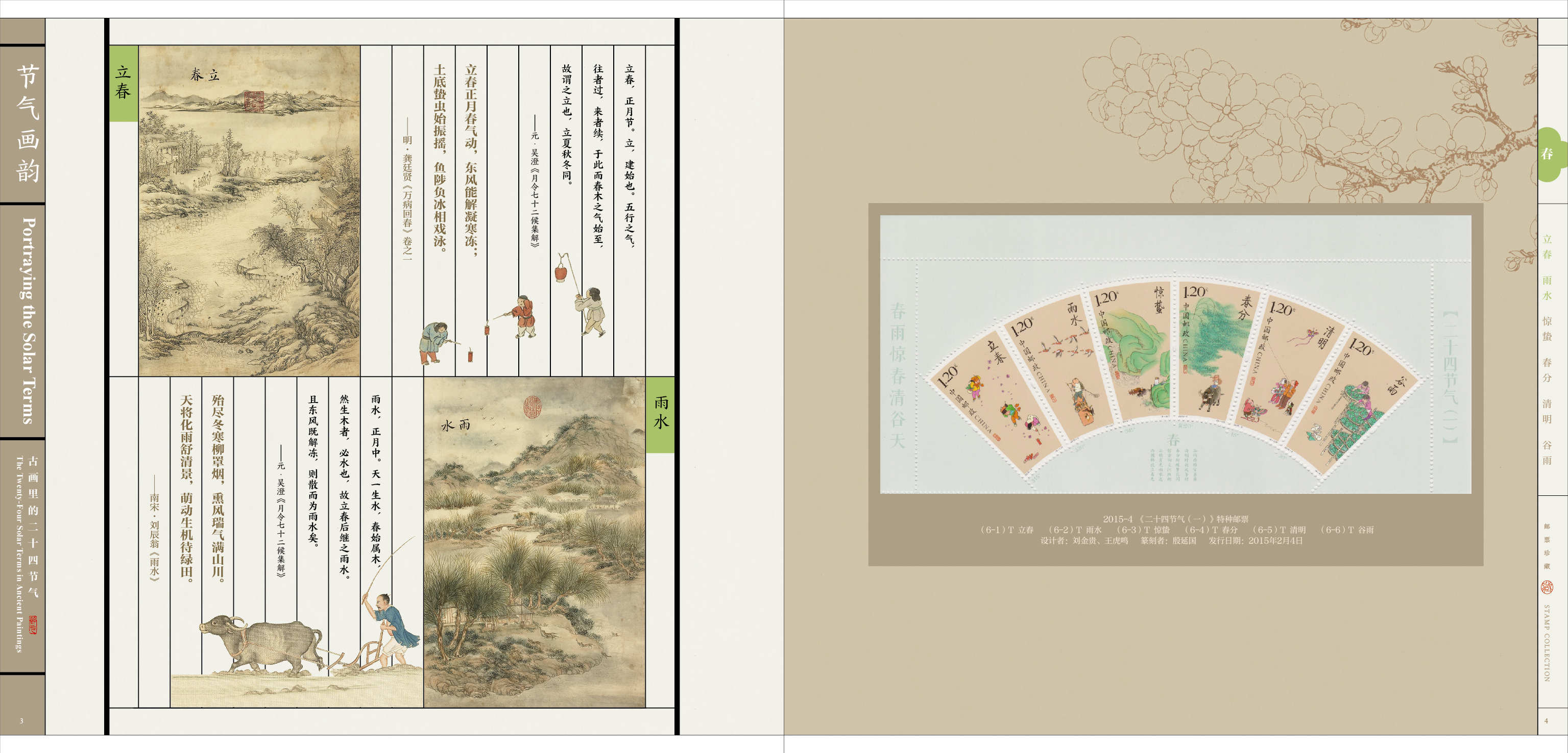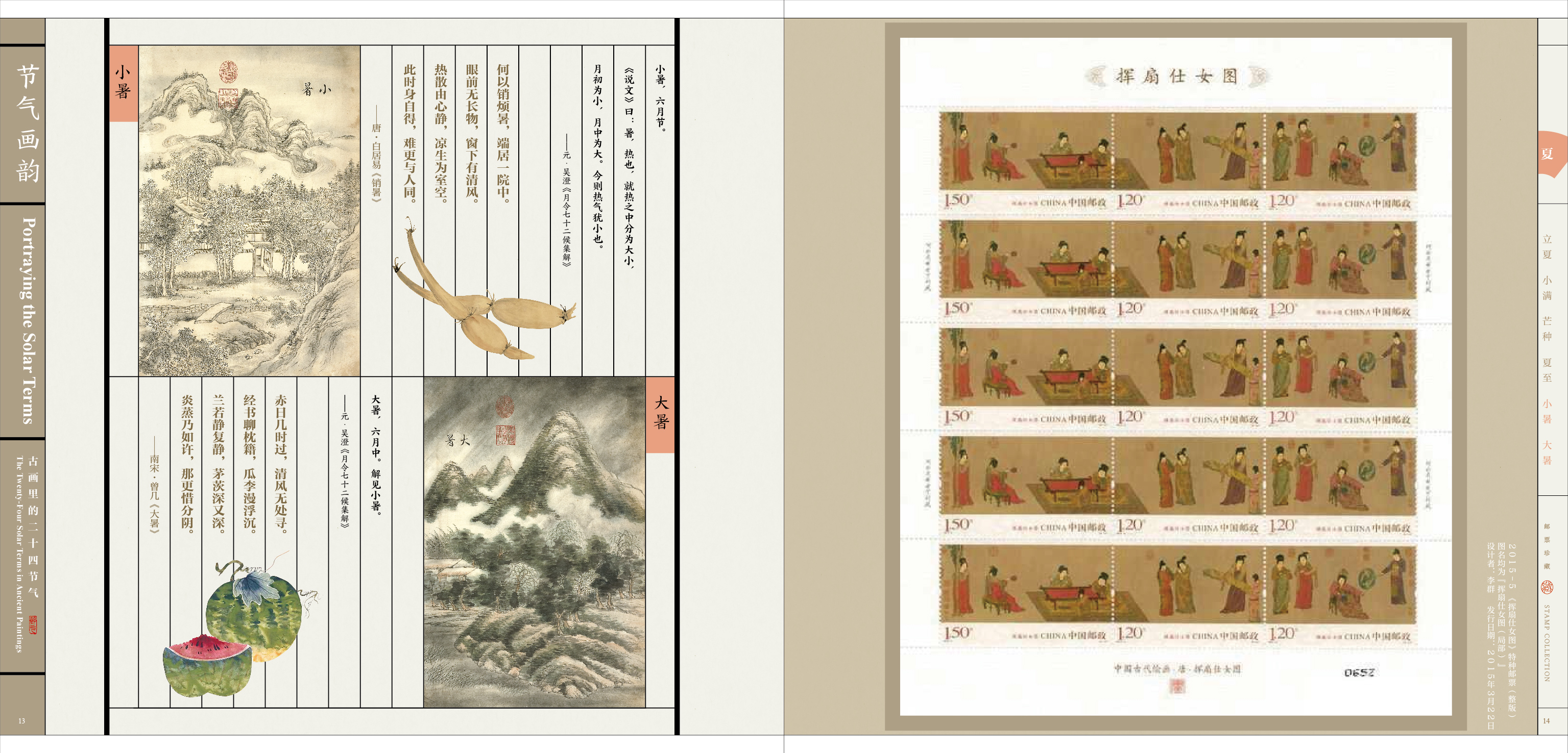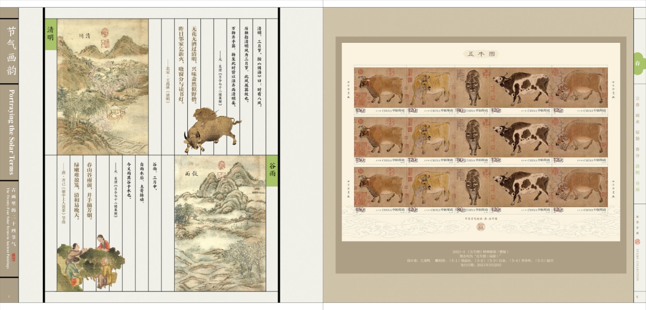 《节气画韵》邮册设计表达古代绘画中的二十几四节气,体现古人在节气中的习俗、农耕、四时变化,册内精选描绘二十四节气的古典绘画,每一幅都是中国画对“四时”美的赞歌。