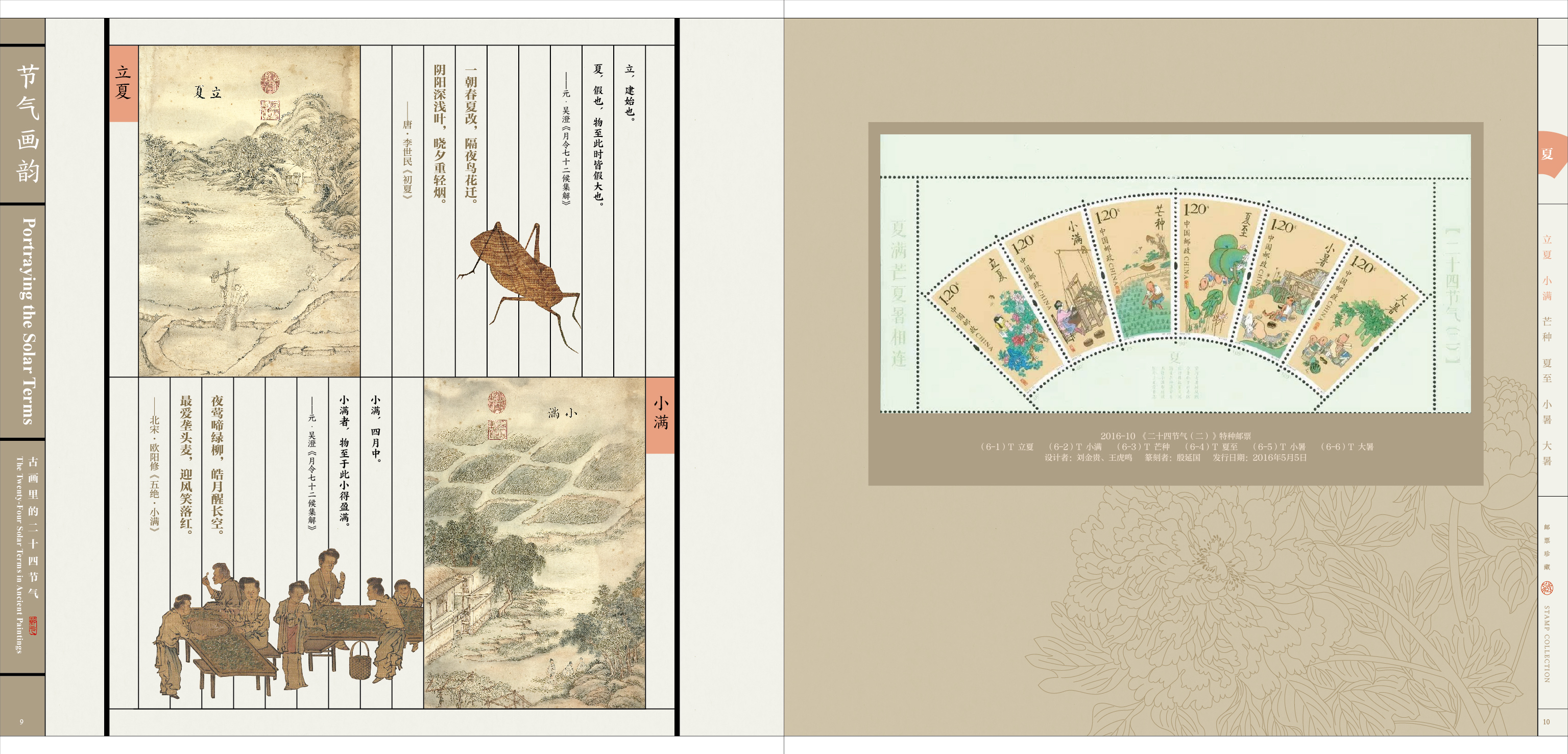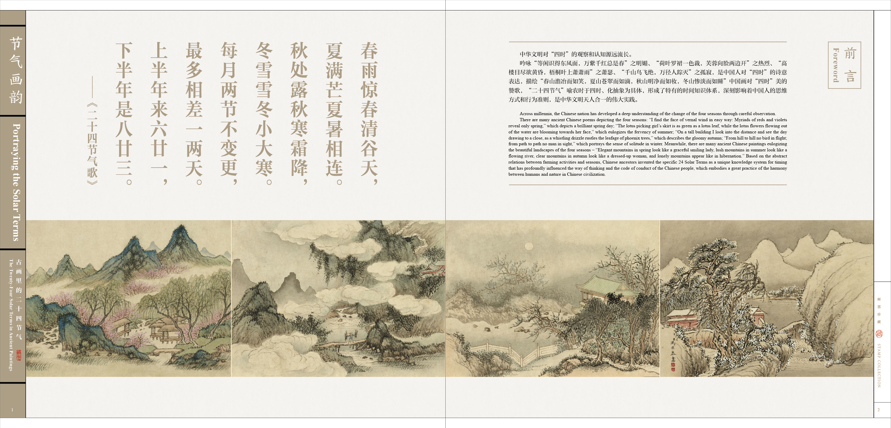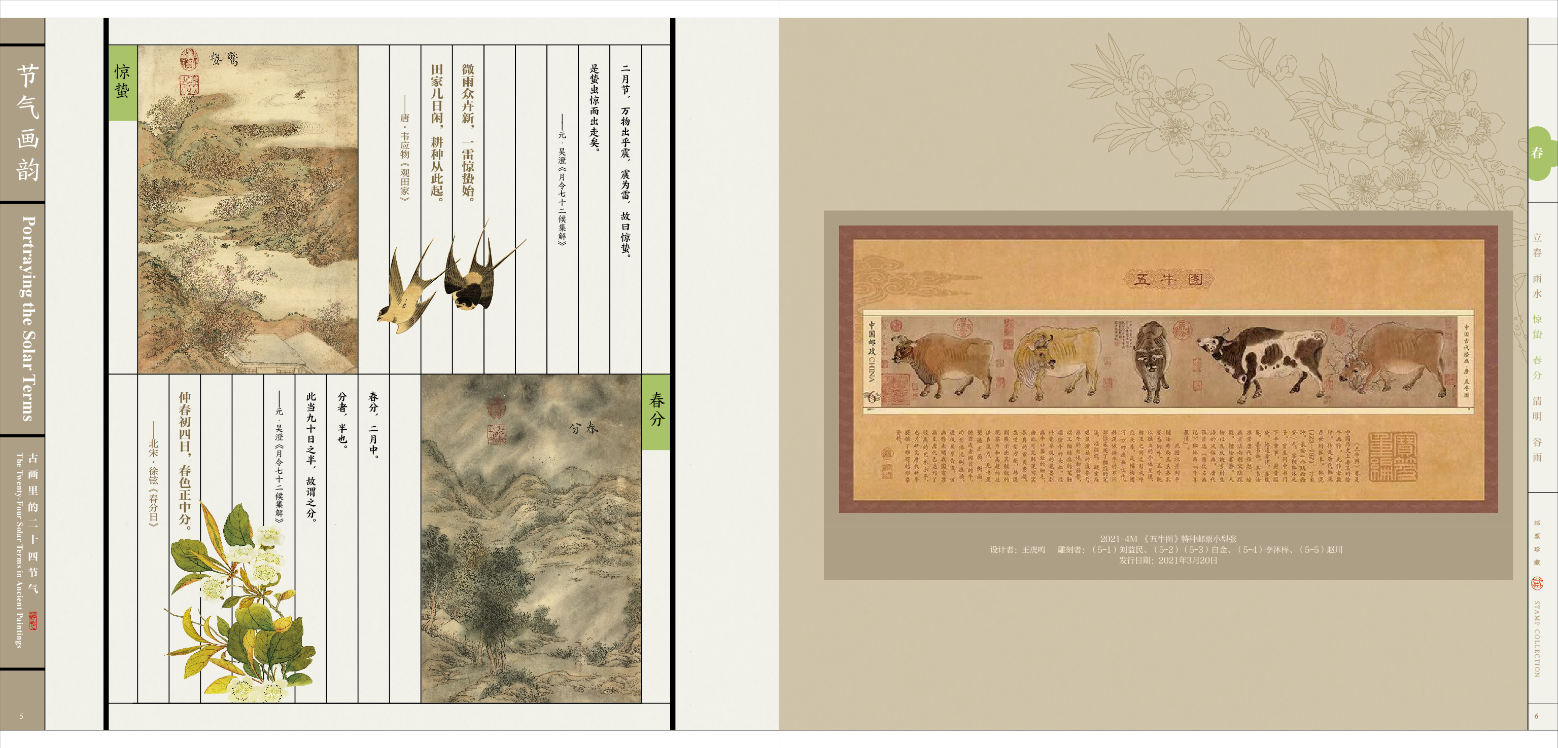《节气画韵》邮册设计表达古代绘画中的二十几四节气,体现古人在节气中的习俗、农耕、四时变化,册内精选描绘二十四节气的古典绘画,每一幅都是中国画对“四时”美的赞歌。