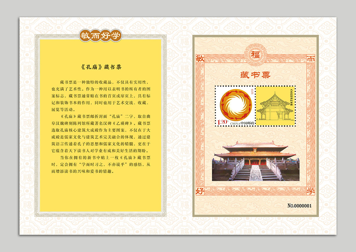 《孔庙》藏书票产品,内含《太阳神鸟》1枚版个性化邮票藏书票1版。