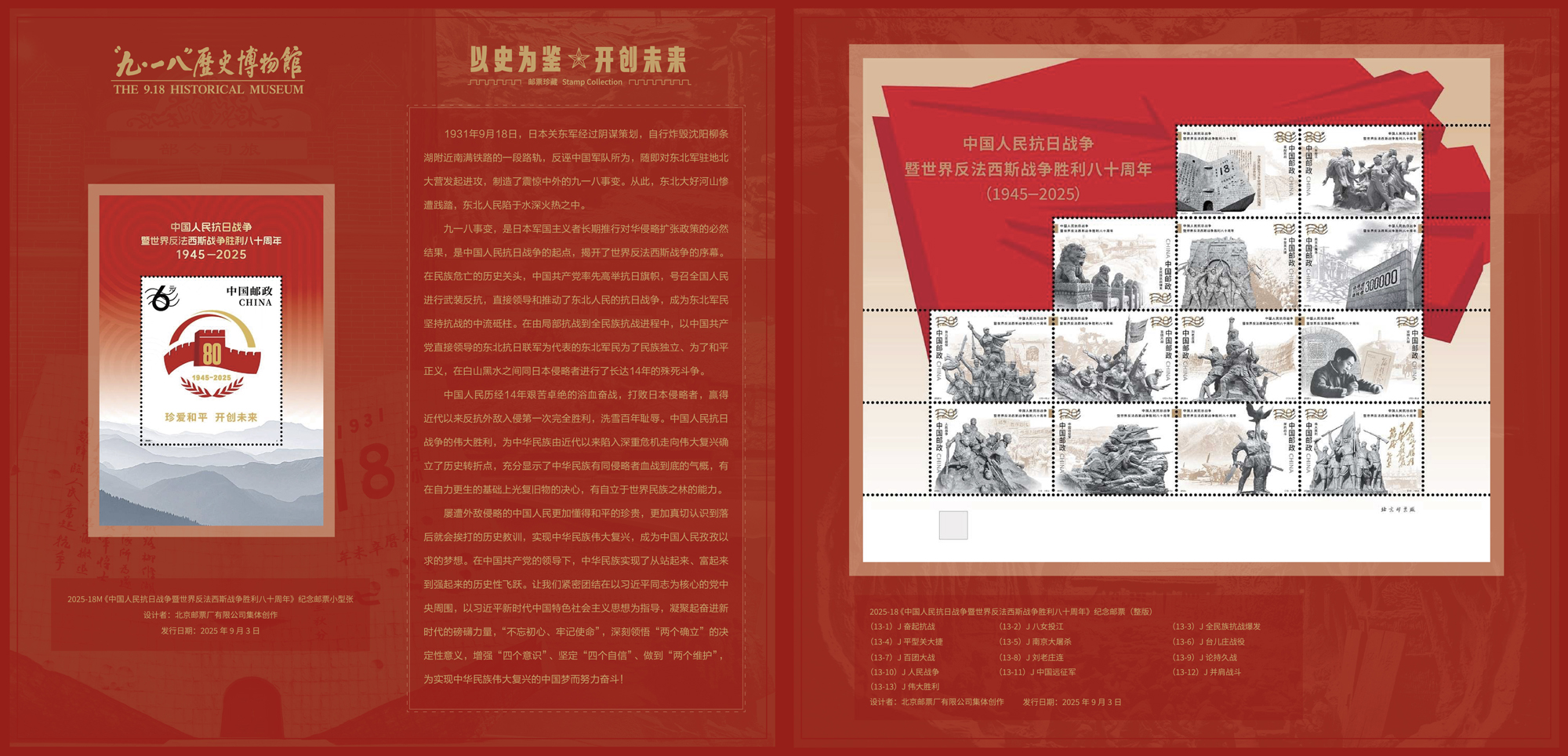 中国集邮有限公司于2025年9月18日发行《以史为鉴 开创未来》纪念邮折,内含《中国人民抗日战争暨世界反法西斯战争胜利八十周年》纪念邮票套票和小型张。