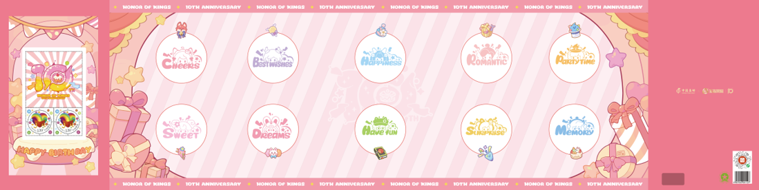 以10周年Q版图库作为设计元素,风琴折形式内页共7页,配置10周年Q版单色印章,10章10色。英雄分别为妲己、小乔、瑶、梦奇、蔡文姬、鲁班七号、朵莉亚、阿古朵、孙膑和安琪拉。玩家可在集戳本正面加盖10枚印章,背面粘贴10周年Q版邮票贴纸,同时搭配个性邮票一版,增加纪念价值,产品萌趣可爱,互动性强。