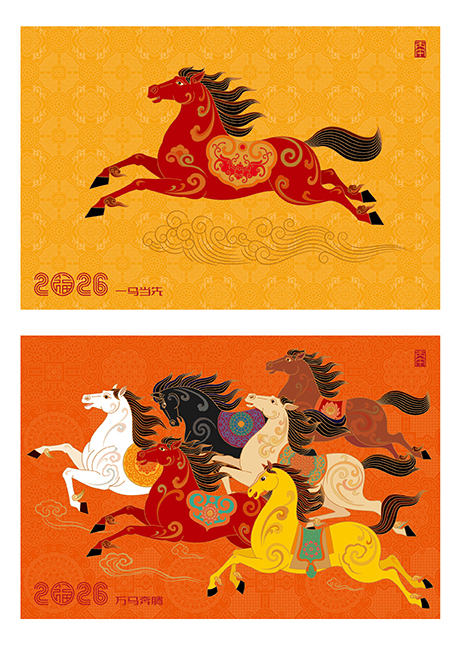 以《丙午年》生肖邮票2-1的马形象为原型设计,主体采用喜庆红色,搭配棕色鬃毛,塑造萌趣可爱的形象。装饰上融入传统卷草纹、云纹、如意纹等吉祥纹样,寓意 “生生不息、祥瑞高升、万事顺遂的美好祈愿”。鞍具处的牡丹花型饱满、层叠绽放,契合牡丹“花中之王”的形态,寓意富贵繁荣。毛绒公仔搭配由邮票设计者、知名设计师王红卫、赵恩重设计的明信片一枚(明信片一套两枚中随机一枚),贴贺8《春》贺年邮票。