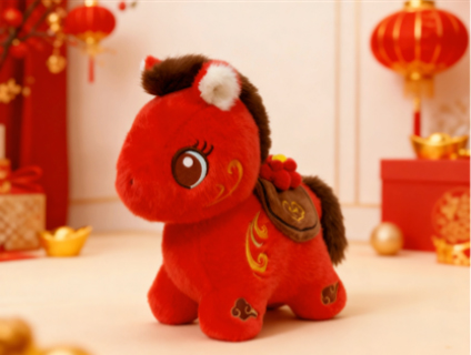 以《丙午年》生肖邮票2-1的马形象为原型设计,主体采用喜庆红色,搭配棕色鬃毛,塑造萌趣可爱的形象。装饰上融入传统卷草纹、云纹、如意纹等吉祥纹样,寓意 “生生不息、祥瑞高升、万事顺遂的美好祈愿”。鞍具处的牡丹花型饱满、层叠绽放,契合牡丹“花中之王”的形态,寓意富贵繁荣。毛绒公仔搭配由邮票设计者、知名设计师王红卫、赵恩重设计的明信片一枚(明信片一套两枚中随机一枚),贴贺8《春》贺年邮票。