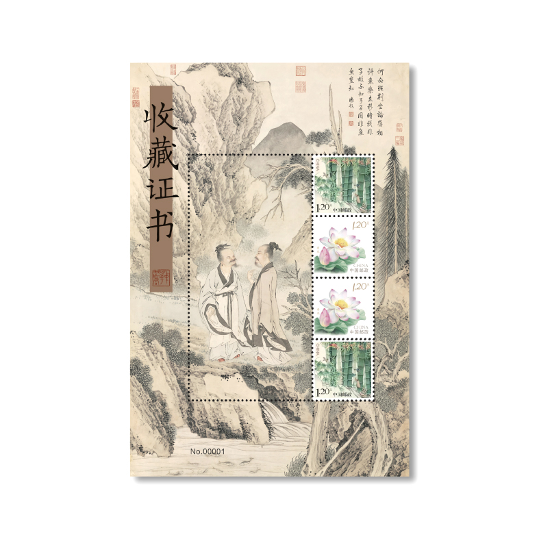 产品设计运用中式山水等相关元素,表现庄子“逍遥齐物”的意境,内页色调淡雅,充满古意。邮折右页放《庄子》个性化邮票收藏证书,收藏证书采用《竹》与《荷花》双主图,附图选取《濠梁图》,画面中庄子与惠子,临池观鱼,格调高雅、古意盎然。