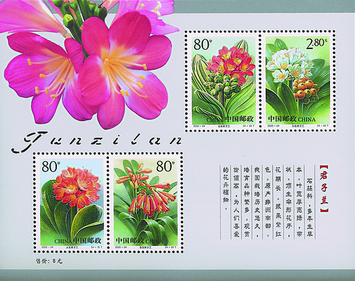2000年12月12日,《君子兰》特种邮票面世,小全张图案为在浅灰色底衬托下,美丽的君子兰栩栩如生,花的下方是一排精美的拼音文字镂空设计,这种在版面上的镂空设计在国内尚属首次。