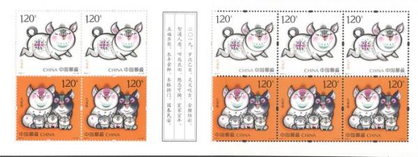 注:同时发行《己亥年》邮票版式三(整张枚数:2套4枚;整张规格:120×160毫米;对联作者:常江),用于赠送给预订2019年全年纪特邮票的预订户。