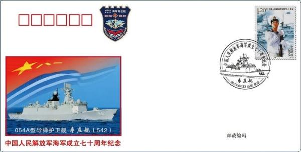 为迎接中国人民解放军海军成立70周年,山东省枣庄市邮政部门将于4月23日发行纪念封1枚,同时启用纪念邮戳1枚,纪念封、戳均以列装解放军海军的054A型导弹护卫舰——“枣庄舰”为主图。