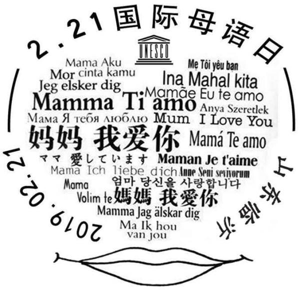 2月21日是联合国教科文组织设定的第20个国际母语日,山东省临沂市邮政分公司特推出由任怀平先生设计的纪念邮戳1枚,戳图以人的头像构图做边饰,线描的嘴唇用世界多种语言深情地喊出:“妈妈 我爱您!”