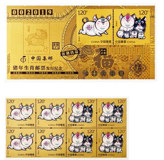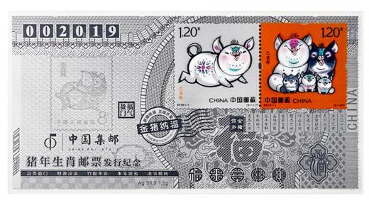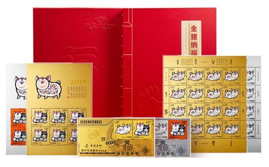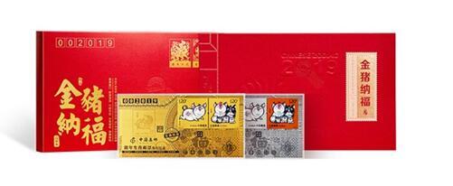 为传播生肖文化,拓展集藏文化市场,中国集邮总公司发行《金猪纳福》2019猪年生肖贺岁邮品。该产品共6个规格,其中金、银各3款产品,分别为《金猪纳福》2019猪年生肖贺岁邮品(四方连纪念金)、《金猪纳福》2019猪年生肖贺岁邮品(四方连纪念银)、《金猪纳福》2019猪年生肖贺岁邮品(小版纪念金) 、《金猪纳福》2019猪年生肖贺岁邮品(小版纪念银)、《金猪纳福》2019猪年生肖贺岁邮品(大版纪念金)、《金猪纳福》2019猪年生肖贺岁邮品(大版纪念银)。仅供全国银行系统发售。