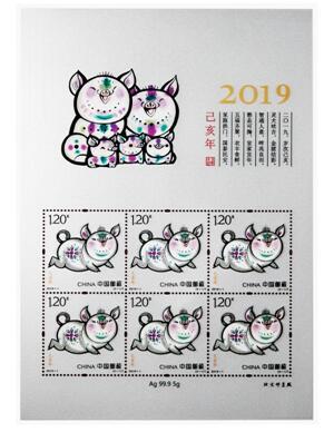 中文名称:《金猪纳福》2019猪年生肖贺岁邮品(小版纪念金、银)
