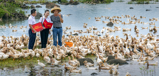 图为海南省临高县新盈镇养鸭农户张建军(右)在邮储银行家庭农场贷款的支持下,养鸭数量超过一万只,预计今年收入可观。 □符德勇 摄影报道