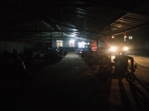 寂静的车棚内,一辆辆电瓶车在夜幕中等待主人。