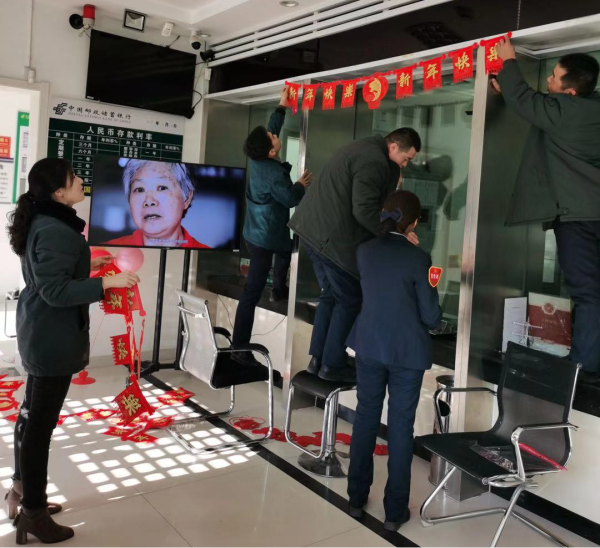 二是鼓励员工创新,提振精气神。发动全体员工积极行动,在营业厅主要位置设置气球、彩带、窗花、拉花等饰品,振奋全员精气神,备战首季开门红。