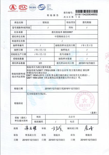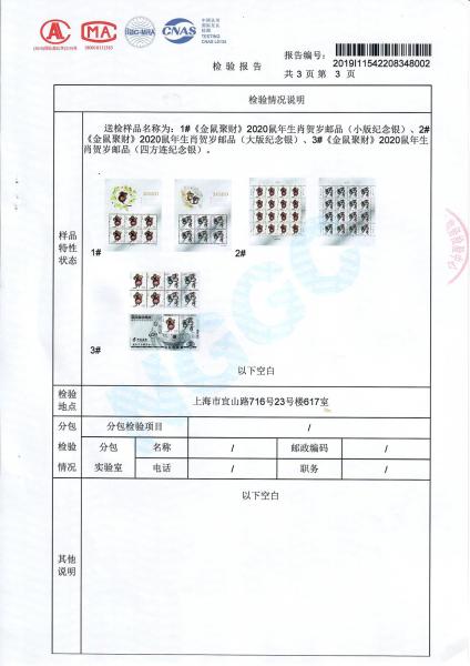 >《金鼠聚财》2020鼠年生肖贺岁邮品(四方连纪念银、小版纪念银、大版纪念银)质检报告