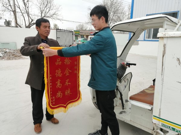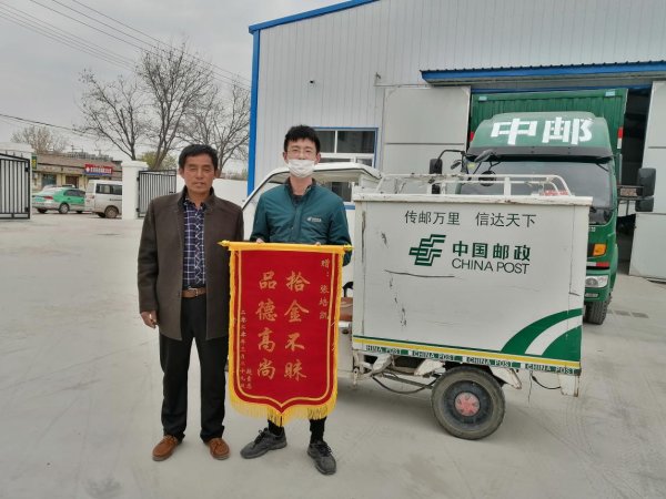 4月1日上午,宁津分公司邮件处理中心院内,客户赵某将一面“拾金不昧、品德高尚”的锦旗交到投递员张培凯手里,感谢他拾金不昧的善举。