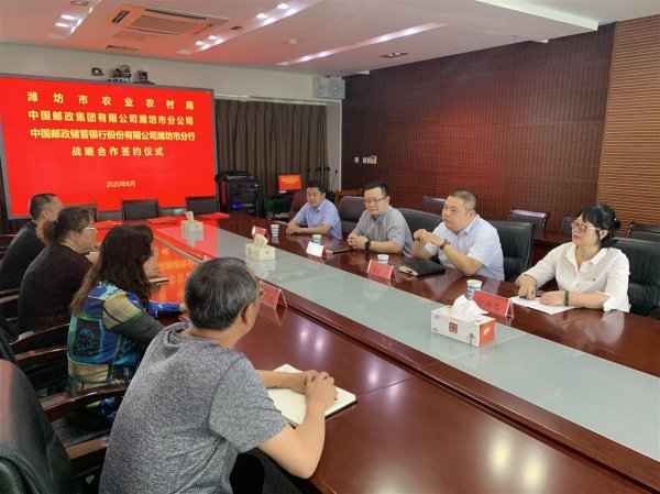 6月11日下午,潍坊市邮政分公司联合市邮储银行与市农业农村局签署战略合作协议。潍坊市邮政分公司、市邮储银行及市农业农村局相关领导和人员出席签约仪式。