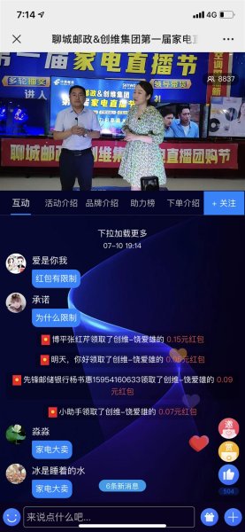 7月10日19:00,聊城市邮政分公司第一届创维家电直播节活动准时开播,该分公司副总经理王永振做客直播间,与广大网友面对面,亲自带货,助力家电销售。