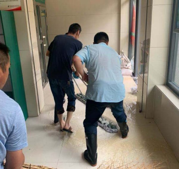 该分公司受损最严重的网点是王鲁支局,防洪沙袋已经挡不住洪水的冲击,营业室内积水没过脚踝。该支局经理于当日凌晨赶到网点,看到被水浸泡的营业室,及时向县分公司报告。该分公司领导班子第一时间赶赴现场查看受灾情况,迅速组织干部职工开展排涝抢险行动,党员同志发挥先锋模范作用,积极参与救灾行动,纷纷表示“积水不排除,我们不撤离”。经过一整天的排涝抢险,该营业室的内涝险情基本排除,生产经营逐步恢复正常秩序。
