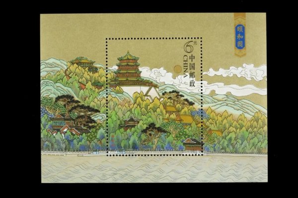这枚小型张表现了万寿山主景群,画面以高耸云表的佛香阁为主体,智慧海、众香界、撷秀亭、排云殿、鱼藻轩、湖色山光共一楼、听鹂馆等建筑如众星捧月般环拱四周,万寿山麓郁郁葱葱、层层叠叠的松柏林木簇拥屏列,旨在传达“阁仗山雄、山因阁秀”的神韵。时间特意选择秋日的早晨,在画面上,璀璨的晴霞、喷薄的旭日将万寿山主景群泼染得流光溢彩,看上去更加充满勃勃生机。