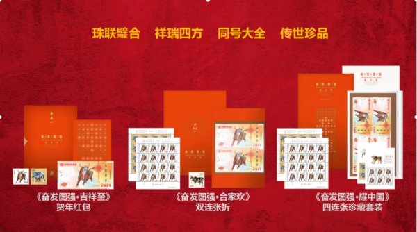 在传统邮品方面,《金牛奋蹄拓福春》生肖文化专题册和《本命年》产品以传统文化为纲,深挖生肖牛文化以及新年祈福文化,书写古往今来精彩的生肖故事,为广大读者带来了一场文化盛宴。其中,《金牛奋蹄拓福春》生肖文化专题册中所选文物展示了18件国宝级文物,内容丰富而珍贵,是一本浓缩的牛年文化百科书,2021《本命年》邮册则表达了中国集邮对2021年本命年邮迷朋友们的美好祝福。