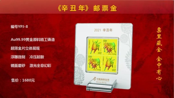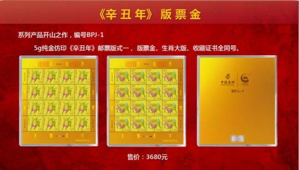 其中《辛丑年》版票金珍藏是中国集邮总公司发行的首款仿印生肖大版邮票的贵金属藏品,也是中国邮政官方发行的首款具备“NFC”技术仿印大版生肖邮票的贵金属收藏品。产品内含5g纯金仿印《辛丑年》邮票版式一,共2版,每版2.5g,配收藏证书1张,并含有《辛丑年》邮票版式一邮折1枚。产品特别配置独立产品编号:BPJ-1,版票金产品、收藏证书与生肖大版邮票版号一致,三号同号,极具收藏价值,是辛丑年典藏、品鉴、馈赠亲友的上佳之品。