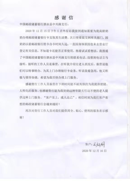 12月16日上午,泗水县邮政分公司中兴支局收到客户王炳明送来的感谢信。“谢谢秦老师,在下班时间为我们提供便捷、人性化的服务,也感谢邮政员工为行动不便的老人提供上门服务!”“不客气,这是我们应该做的。”