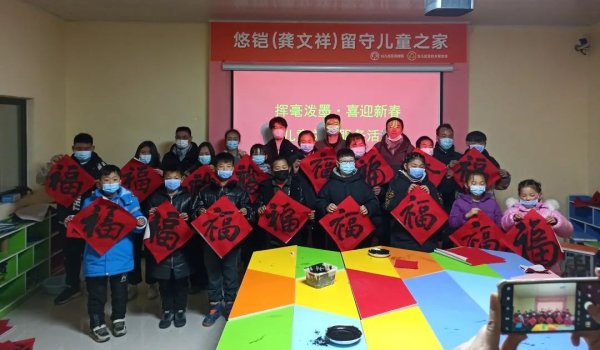 志愿者陪伴孩子们一起做萝卜蹲、串名字、甲地乙地、大风吹等游戏,在精彩的游戏中使孩子们感受到快乐和爱。在书法家们的指导下,孩子们拿起毛笔,写下一张张福字,为即将到来的新春营造了喜庆的氛围。