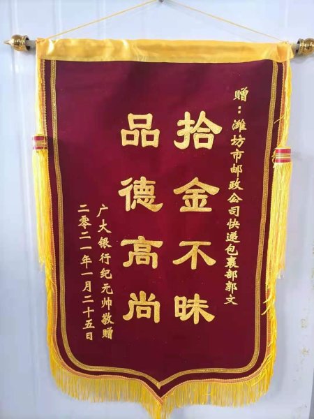 1月26日,一位男士来到潍坊樱园投递部,将一面印有“拾金不昧 品德高尚”的锦旗送到投递员郭文手中。
