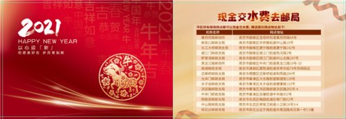 目前59家南京城区邮政网点均可以办理代缴水费业务,其中有6个试点网点投放了宣传广告并提供缴纳水费赠送明信片服务。“一些老年人由于年龄和身体上的原因,即便经过培训,也很难掌握新技术。我们在拥抱信息化的同时,确实应该充分考虑他们的特殊情况。”集邮与文化传媒部经理曾伟表示,用户在其中6个试点的网点缴纳水费后还可获赠一张明信片,主片为牛年新年祝福,附片为水费标准和部分缴费网点地址,便于老年用户保存和查看。