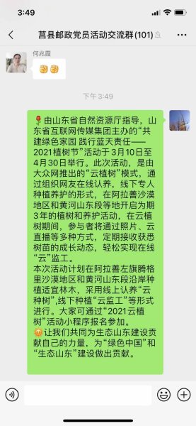 为响应全民义务植树号召,提高员工环保意识,莒县邮政分公司在组织植树活动的同时,组织员工参与由省自然资源厅指导,省互联网传媒集团主办的“共建绿色家园 践行蓝天责任——2021植树节”活动。