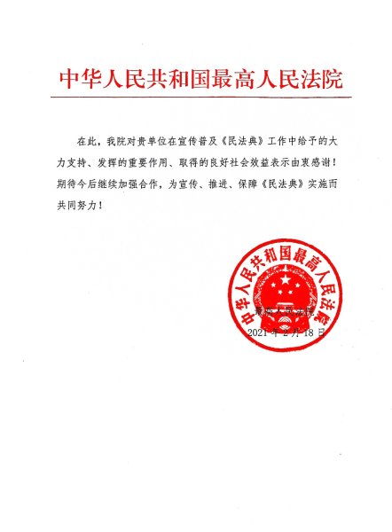 近日,中华人民共和国最高人民法院发来一封感谢信,对中国集邮有限公司在宣传普及《民法典》工作中给予的大力支持、发挥的重要作用、开辟的宣传途径、取得的良好社会效益表示衷心感谢!