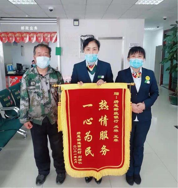 原来,近期刘大叔家急需用钱,但是他的家属患有精神残疾,无法自行办理社保卡密码重置业务,修改不了密码,社保卡内的钱就取不出来,急得他不知如何是好。几天前,他来到绣惠支局询问如何办理,支局经理术林了解了刘大叔家的情况后,安慰他,“符合相关业务规定的前提下,我们可以上门服务为你家属办理业务。”随后,术林与柜员王菲及时到客户家里为其提供了上门服务,解决了客户的取款难题,解了客户的燃眉之急。出于对邮政一心为民服务的感激之情,刘大叔特地为绣惠支局制作了这面锦旗,“以后有了钱就得存邮政,俺还要给俺家亲戚们都说,钱存在邮政放心又方便。”刘大叔露出开心的笑容。