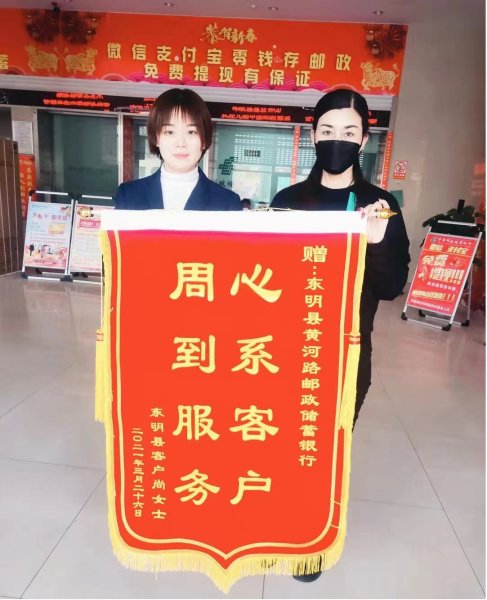 3月27日下午,客户尚女士来到东明分公司黄河路邮政支局,送上一面书有“心系客户 周到服务”的锦旗,以表达对该支局工作人员的感激之情。