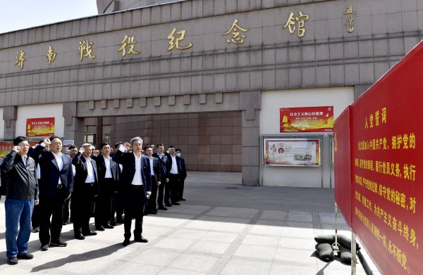 在陈列展厅内,伴随着讲解员的讲解,大家详细了解济南战役的全过程,观看了大量珍贵的战时照片和史实资料。一幅幅珍贵的照片、一件件历经战火的兵器、一份份翔实的史料,让大家深切感受到革命先烈忠贞不渝、忘我奉献的坚定信念和革命情怀,切实感受到我军指战员勇敢战斗、不怕牺牲、敢打必胜的战斗精神和英雄气概,进一步激发了党员干部强烈的爱党爱国热情。随后,在纪念馆广场,韩广岳书记带领全体党员领导干部列队肃立,面向党旗,重温了入党誓词。