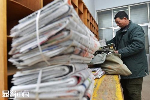 董乃军把邮件整理好准备出发投递,他每天要投递300多份邮件,大大的邮包沉甸甸的。