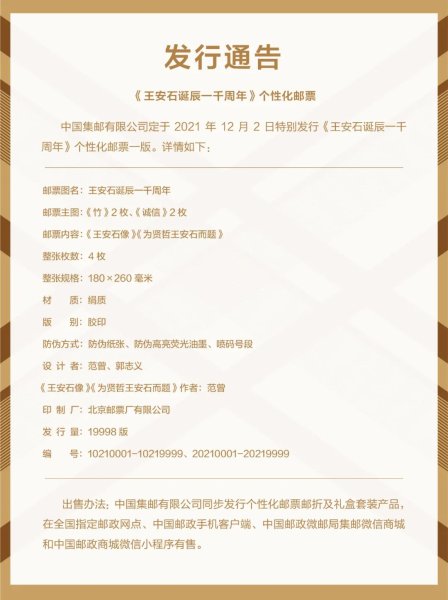 2021年是王安石诞辰一千周年。文化是民族的血脉,邮票是国家的名片邮票是挖掘中国传统文化、承继先贤精神、讲好中国故事、传播中国声音、展现中国精神的最佳载体。为纪念先贤风骨,中国集邮有限公司定于2021年12月2日发行《王安石诞辰一千周年》个性化邮票一版。