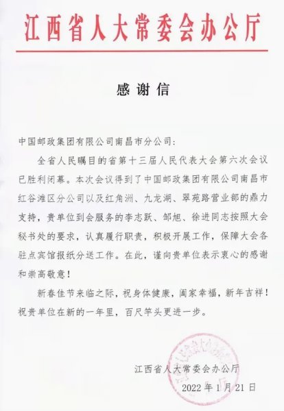2月9日,南昌市邮政分公司收到了一封来自江西省人大常委会办公厅的感谢信。信中对我省邮政认真履行职责,全力保障服务全省“两会”工作表示肯定和感谢。