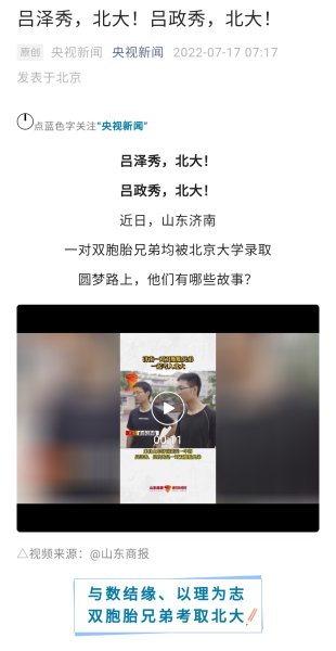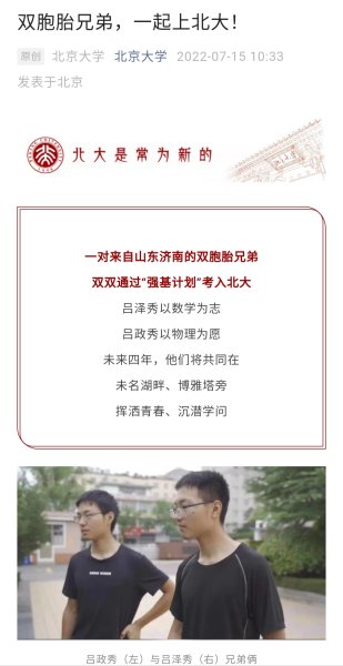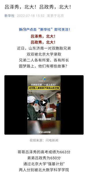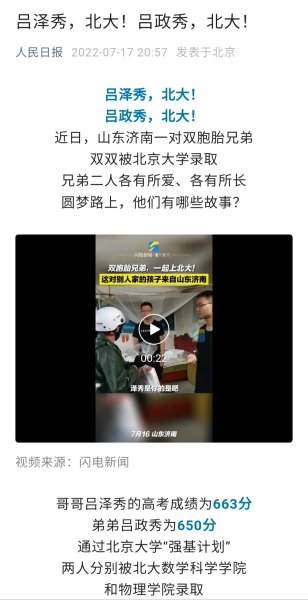 哥哥吕泽秀的高考成绩为663分,弟弟吕政秀为650分,两人分别被北大数学科学学院和物理学院录取。