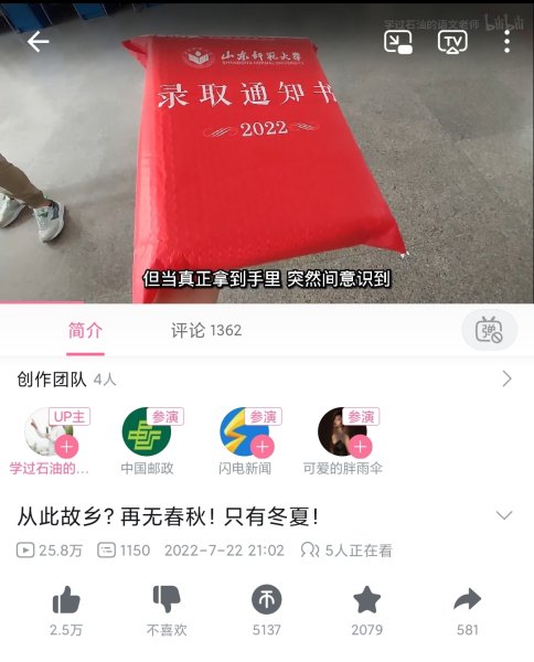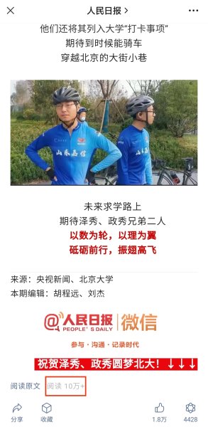 近日,山东邮政投递员冒雨为济南莱芜区双胞胎投送北大录取通知书的新闻视频,一经发布,就被“人民日报”“新华社”“央视新闻”“中国日报”“北京大学”官方微信公众号和人民网、中国青年网微博以及中国邮政抖音号等媒体竞相转发。其中“人民日报”“新华社”“央视新闻”官方微信公众号和中国邮政抖音号“4个”新媒体平台短时间内的阅读量或点赞量都达到10万+,冲上新闻热搜,成为人们茶余饭后热议的话题,网友评论:羡慕到爆……