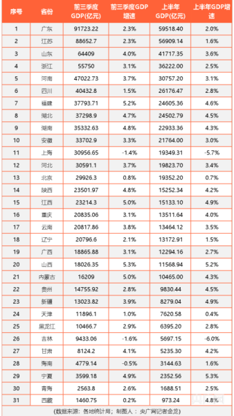 11月2日,陕西统计局发布数据显示,前三季度全省实现地区生产总值23501.97亿元,按可比价格计算,同比增长4.8%。至此,全国已经有31个省市发布了前三季度地区生产总值(GDP)增长情况,其中广东经济总量达91723.22亿元,继续稳居全国第一,江苏、山东分别位列第二名和第三名。