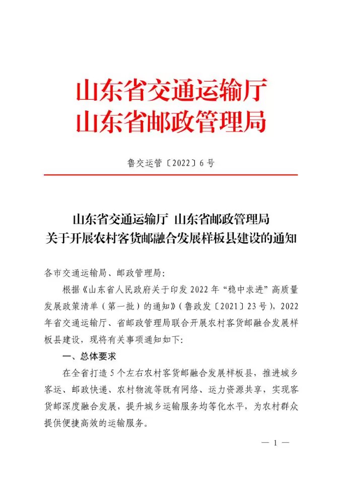 根据《山东省人民政府关于印发 2022 年“稳中求进”高质量发展政策清单(第一批)的通知》(鲁政发〔2021〕23 号),2022 年省交通运输厅、省邮政管理局联合开展农村客货邮融合发展样板县建设,现将有关事项通知如下: